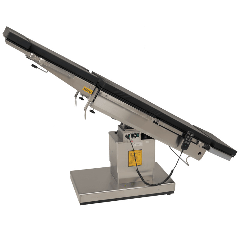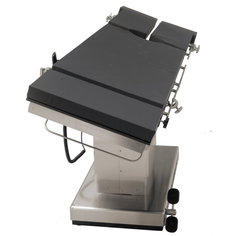 2. X-ray & Durability: High-strength composite tabletop supports X-ray exams and C-arm use. Brushed stainless steel covers (column, base, side panels) with powder-coated/chrome-plated accessories. Optional mattresses (high-density sponge or memory foam).